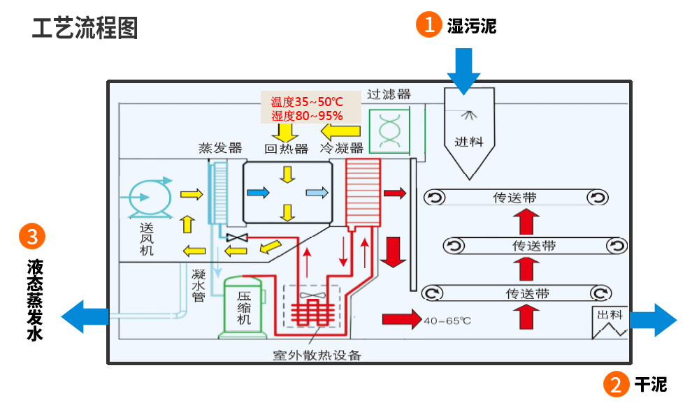 注:1、標(biāo)準(zhǔn)除水噸數(shù): 進(jìn)泥含水率65%,出泥含水率25%,可以除掉的水噸數(shù);★因不同的污泥性質(zhì)、含水率不同,其干燥周期差異有所偏差。